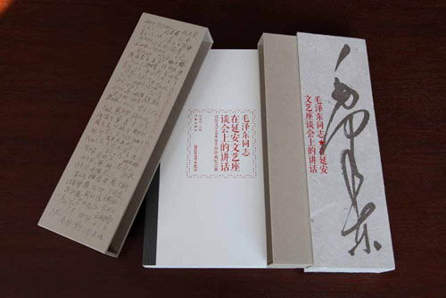 《毛澤東同志在延安文藝座談會上的講話》(百位文學藝術家手抄珍藏紀念冊)(作家出版社)手抄本,文字也是手抄風格,在設計排版方面十分成熟,很精煉,書脊用紙很好,重點內容文字較大,一般內容文字較小,層次分明;封面精致且大方,是一個盒子,恰似一個“豐碑”的形態,很有層次感,有強烈的三維感;政策性的文字表現地不單調不枯燥,可以把文獻與文獻歷史巧妙地結合起來,很能使人產生親近感,是對政治性文件的革新,很有創新。