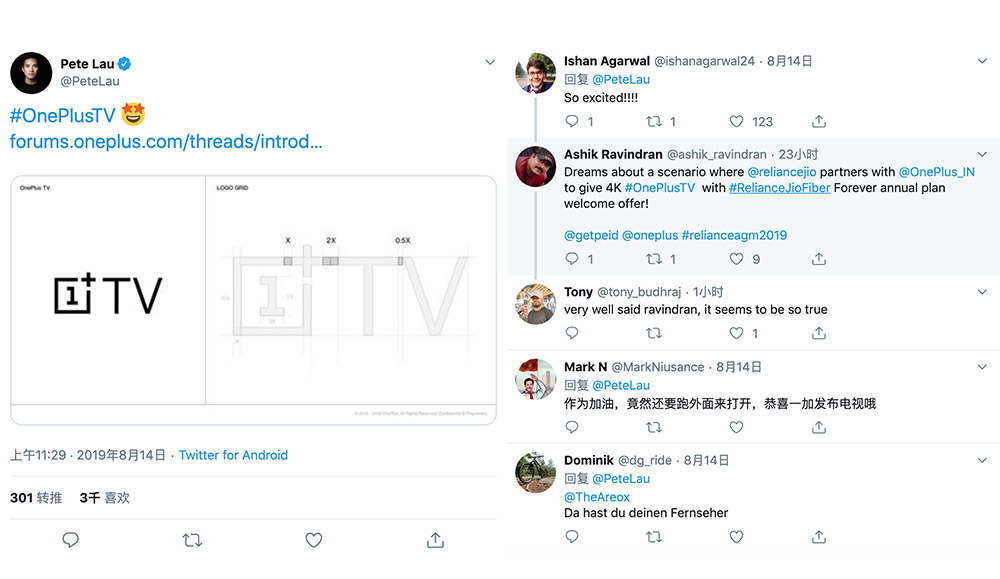 8月14日,一加創始人、CEO劉作虎在Twitter上發布了一加即將推出的電視品牌名稱“OnePlus TV”以及全新的LOGO設計。