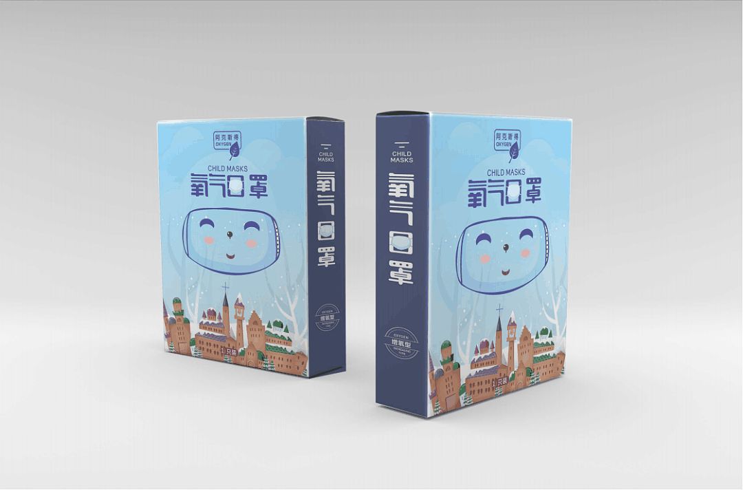 冬季飄雪的故事性場景插畫設(shè)計(jì),配以歐洲風(fēng)情的城堡元素,口罩包裝也更加唯美動(dòng)人,包裝中央的笑臉設(shè)計(jì),仔細(xì)一看其實(shí)是口罩的輪廓形象,暗藏玄機(jī)的IP描繪卻也親和感十足。