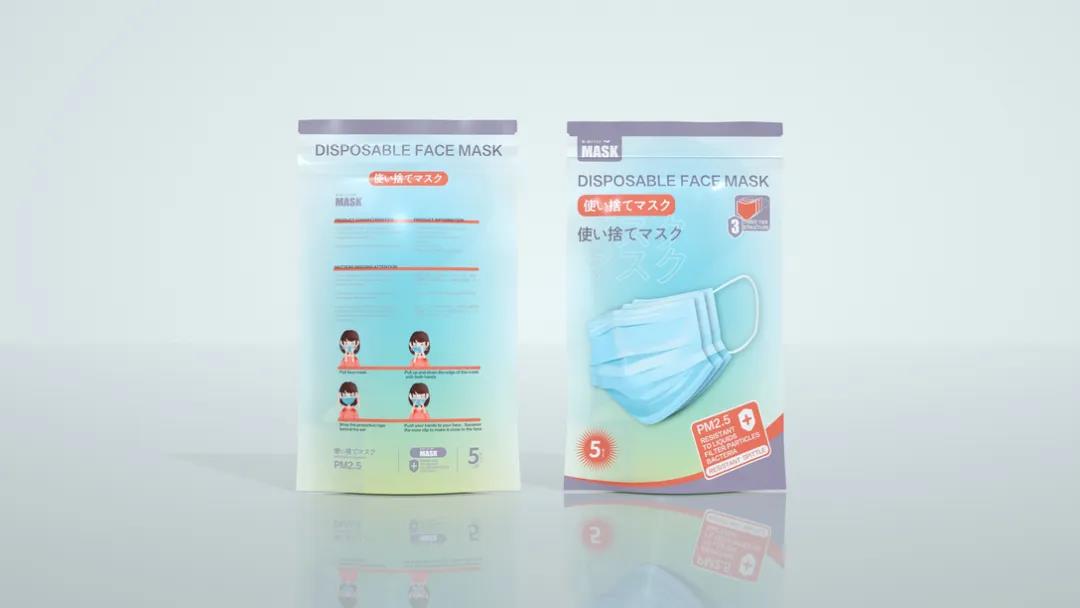這款包裝較為清新簡約,同樣使用漸變層次的設(shè)計(jì)豐富了包裝內(nèi)容,口罩的立體設(shè)計(jì)突出明了封面的文字,標(biāo)記采用不同顏色重點(diǎn)分明,消費(fèi)者可一目了然,滿足需求。